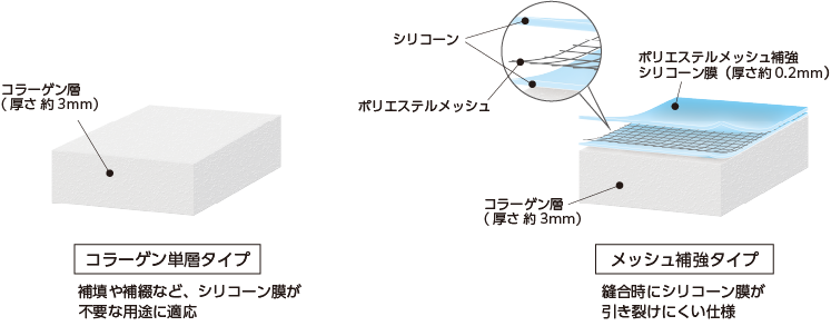本品(テルダーミス真皮欠損用グラフト)は、若いウシの真皮をプロテアーゼ処理し、テロペプタイド部分を消化切断した抗原性の少ないコラーゲンを原材料とした下層及び外部からの感染を防止するとともに滲出液等の水分透過を調節するシリコーンの上層からなります。また、下層(コラーゲン層)のみの品種、上層にメッシュを組み込んだ品種があります。